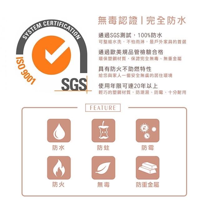 輕巧塑鋼材質,防水特性讓您不必再擔心因潮濕而腐蝕發霉。