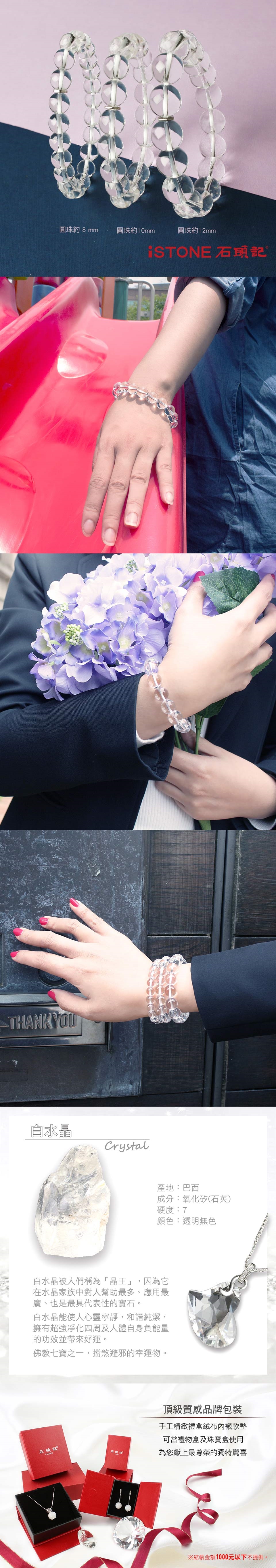 石頭記白水晶手鍊,晶瑩剔透似水冰清,綻放屬於妳的腕間閃耀姿態,映襯出你的嬌貴柔媚,讓你舉手投足間散發出最迷人的光彩,更為妳招來好運,護身平安、否極泰來!