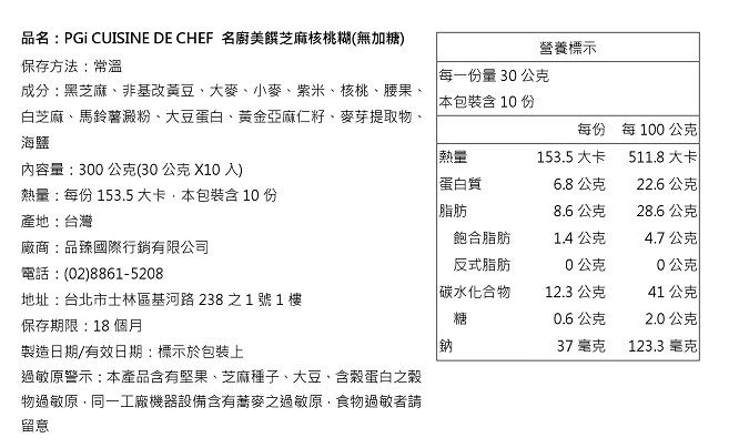 本產品含有堅果、芝麻種子、大豆、含穀蛋白之穀物過敏原,同一工廠的機器設備含有蕎麥之過敏原,食物過敏者請留意。