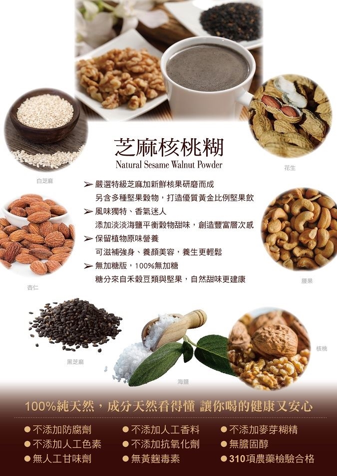 嚴選食材:精選上等堅果穀物,採先進技術,保留穀物堅果營養與香氣,100%全天然無添加