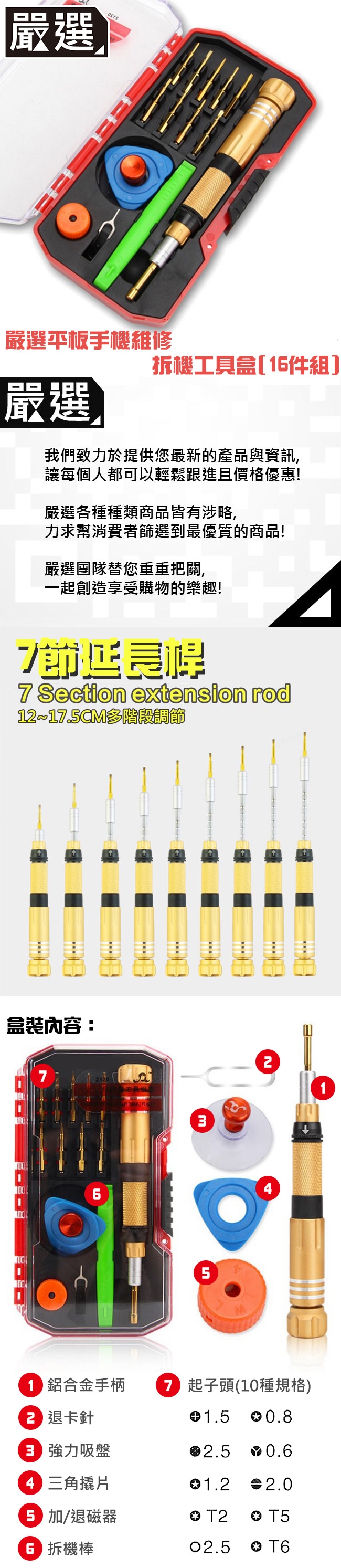 ◆ 附有各式螺絲頭、雙頭撬棒、頂針、吸盤、三角片、加磁圈;螺絲起子手柄