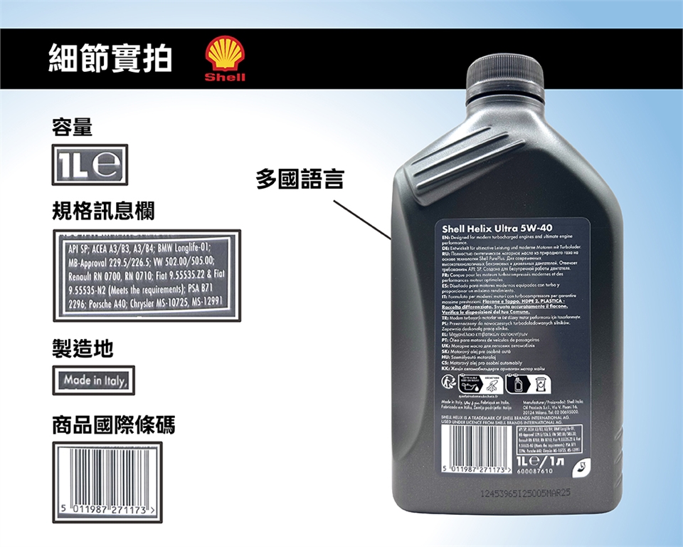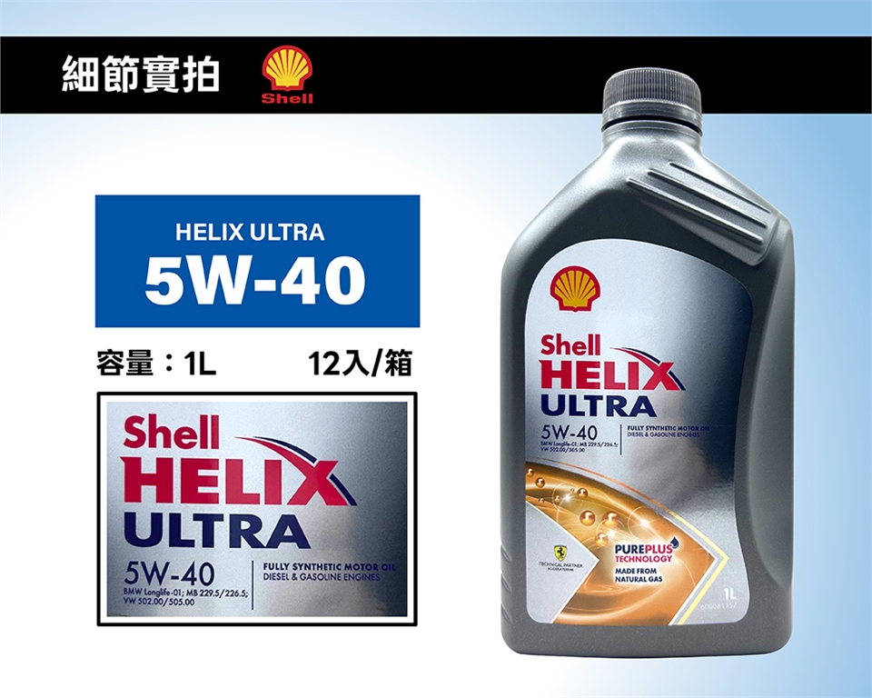 Shell Helix Ultra 5W-40 採用 PurePlus 天然氣合成技術,提供極致潔淨度。作為法拉利技術合作夥伴,具備卓越抗氧化穩定性,能於高溫下維持強韌油膜。符合 API SP 最新標準,適用高效能汽、柴油引擎,有效減少沉積物並延長引擎壽命。