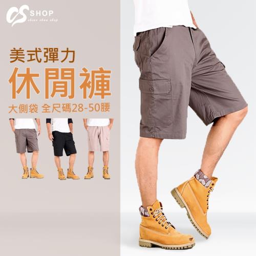 CS衣舖 美式大側袋側邊鬆緊腰圍透氣彈力工作短褲休閒褲