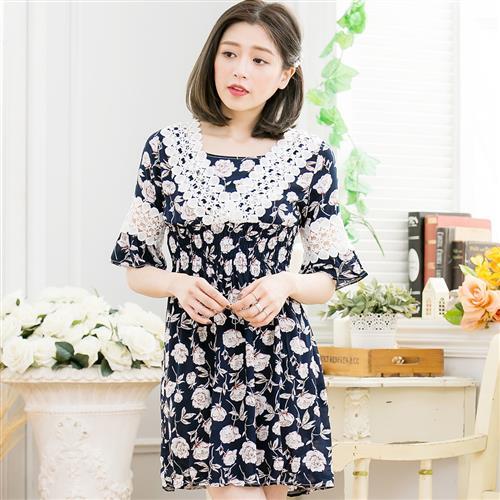 全尺碼-圓領拼接V型蕾絲圖案洋裝(共三色)lingling