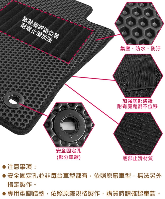 踏墊使用時,務必安置好,減少移動,若駕駛座有安全固定扣,務必扣緊。