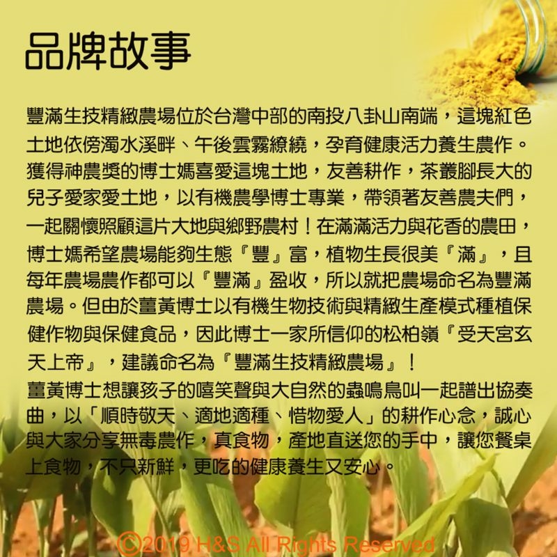 豐滿生技精緻農場位於台灣中部的南投八卦山南端,這塊紅色土地依傍濁水溪畔、午後雲霧繚繞,孕育健康活力養生農作。獲得神農獎的博士媽喜愛這塊土地,友善耕作,茶叢腳長大的兒子愛家愛土地,以有機農學博士專業,帶領著友善農夫們,一起關懷照顧這片大地與鄉野農村!在滿滿活力與花香的農田,博士媽希望農場能夠生態『豐』富,植物生長很美『滿』,且每年農場農作都可以『豐滿』盈收,所以就把農場命名為豐滿農場。但由於薑黃博士以有機生物技術與精緻生產模式種植保健作物與保健食品,因此博士一家所信仰的松柏嶺『受天宮玄天上帝』,建議命名為『豐滿生技精緻農場』!