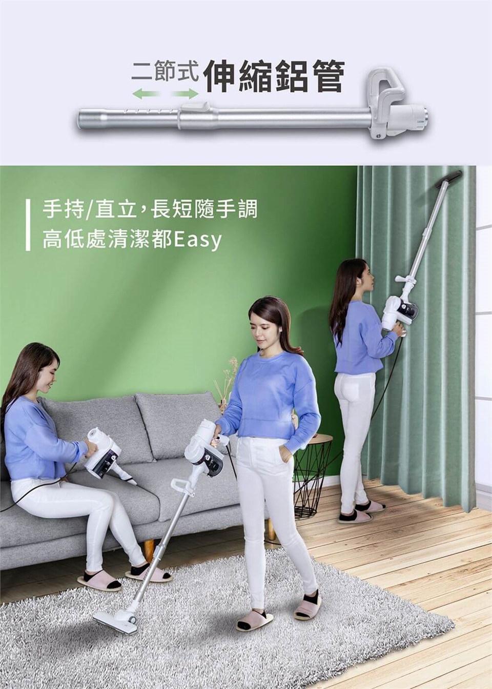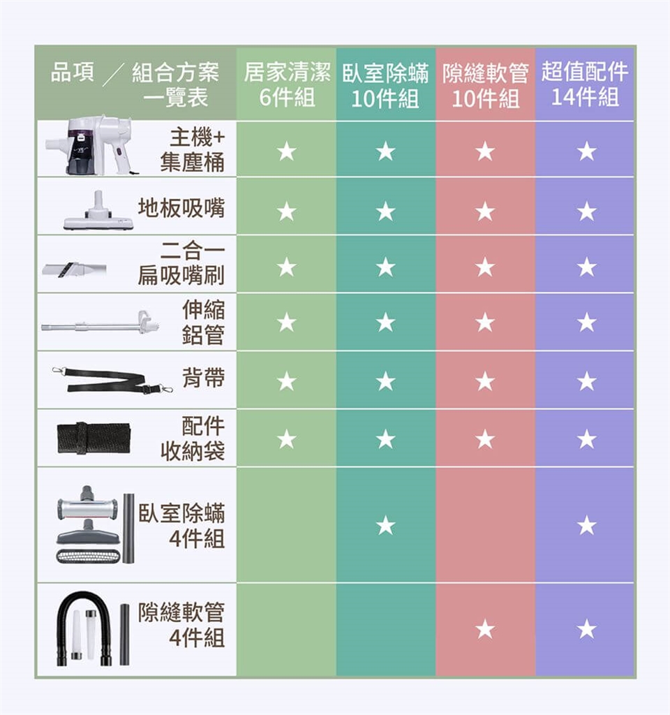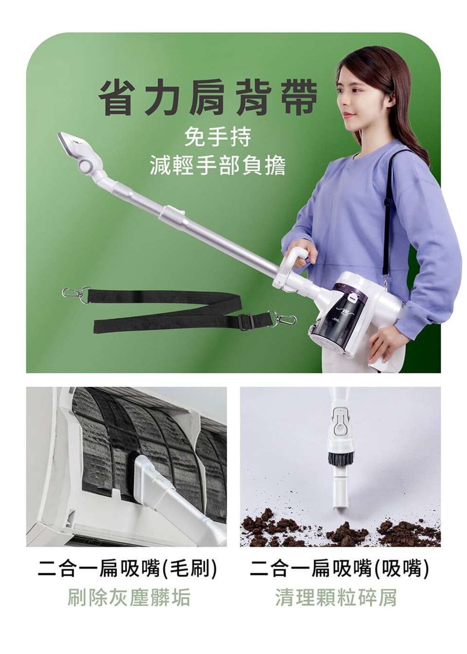 包裝內容物:主機x1、兩節式伸縮鋁管x1、地板吸嘴x1、二合一扁頭吸嘴x1、背帶x1、收納袋x1、說明書x1