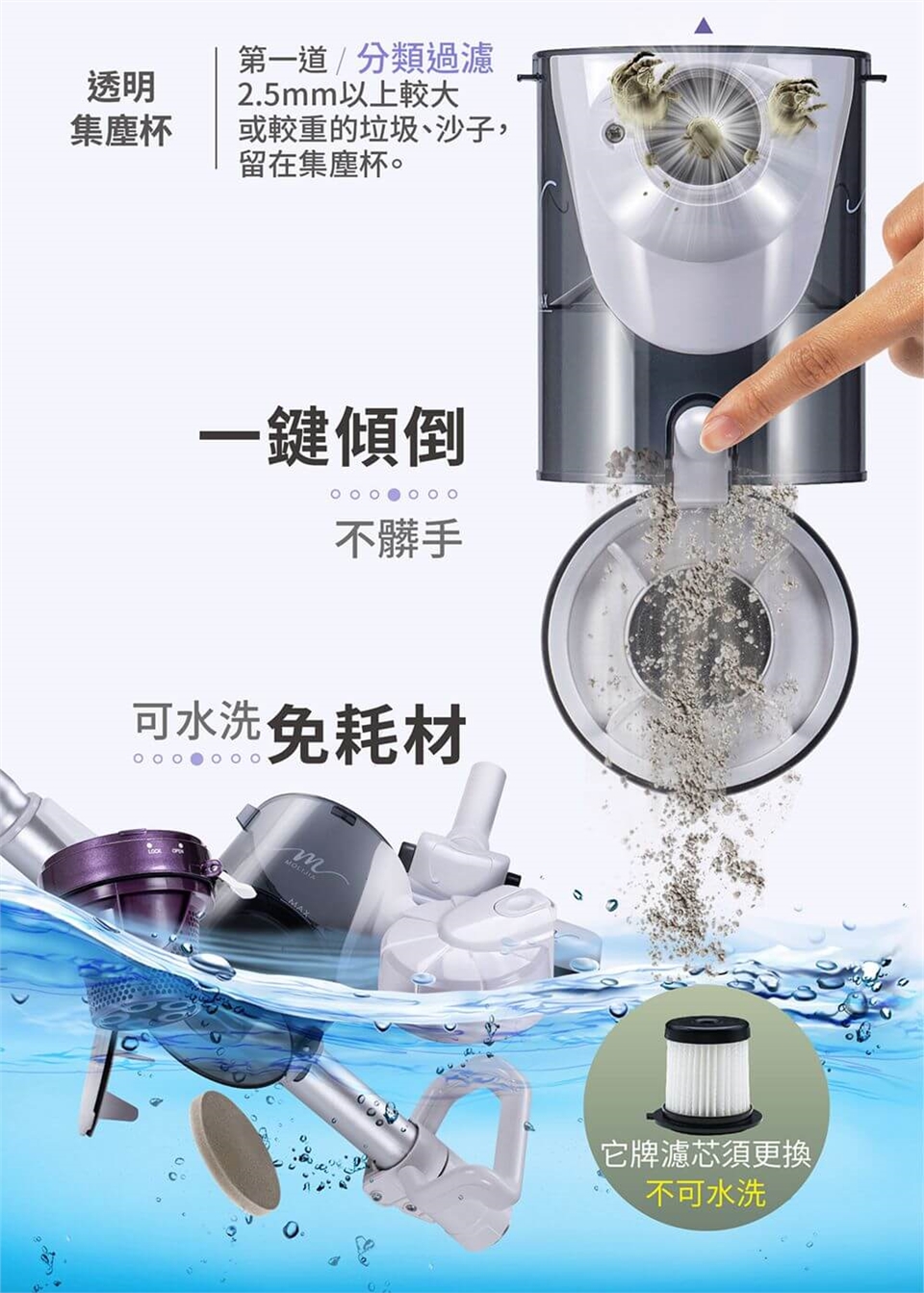 產品尺寸:長29.7 cmX寬11cmX高21cm±5%(主機+集塵桶)