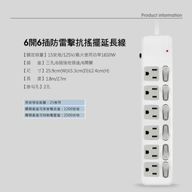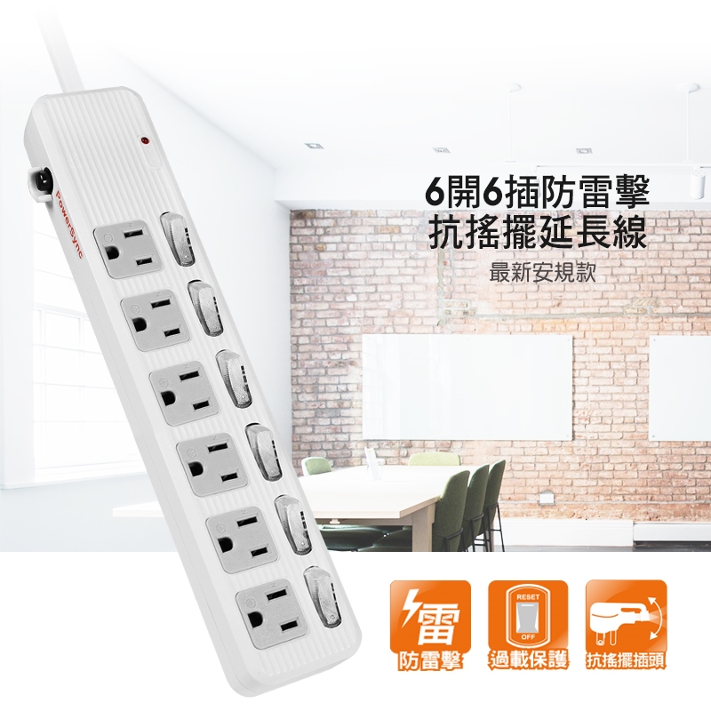 ● 品名:防雷擊6開6插抗搖擺延長線