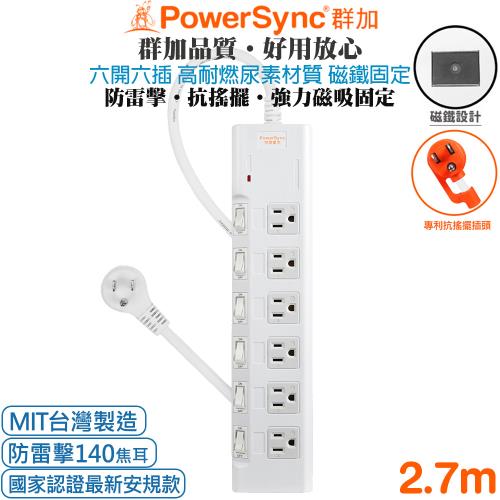 (台灣製造)群加 PowerSync 3P 6開6插高耐燃尿素防火防雷擊延長線(磁鐵固定)2.7米PWS-EMS6627