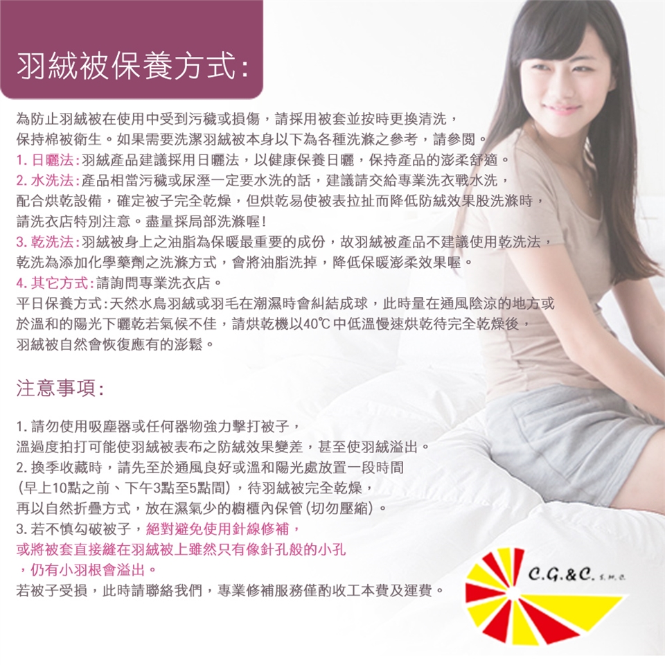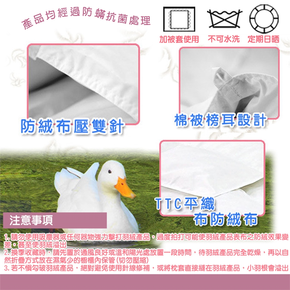 產品維持最好的品質,並搭配TTC平織高級【防絨布】讓您的羽絨被,被面不跑毛,專業車工更車上四邊綁被耳等高檔設計,讓您在使用時,覺得貼心!