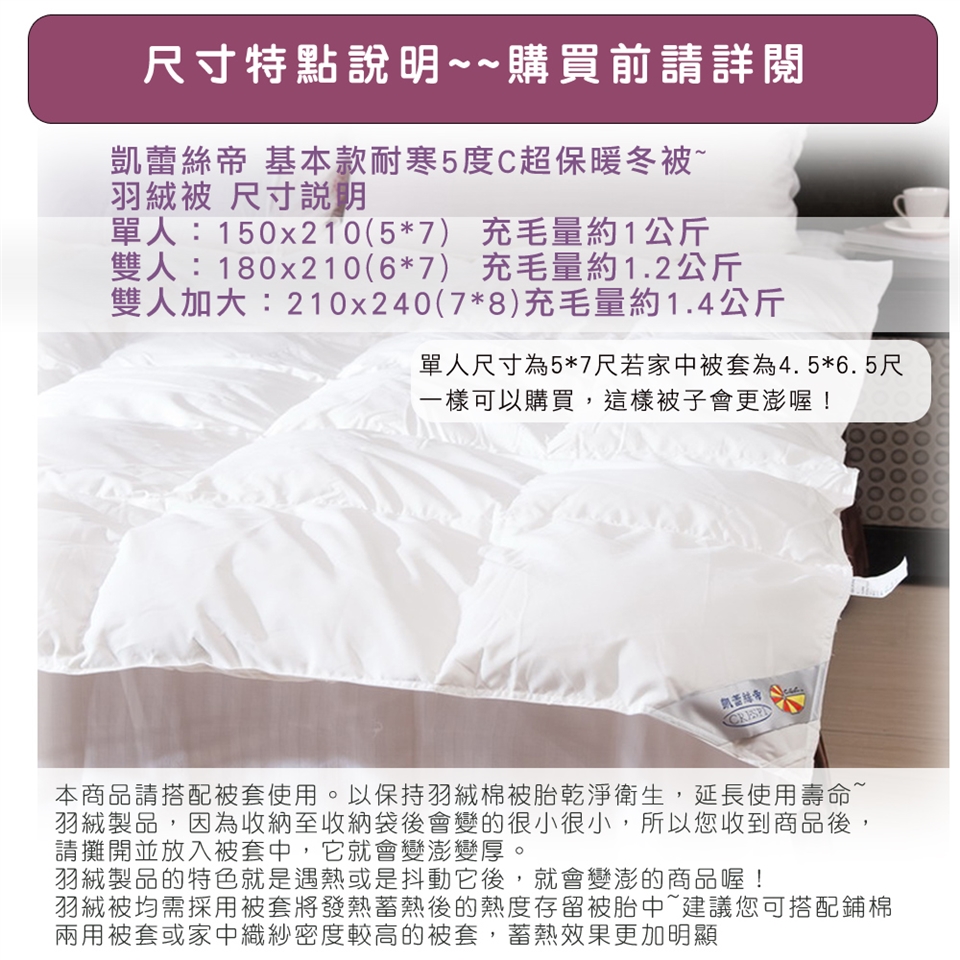 .本產品為天然羽毛所製造填充而成,故有淡淡羽絨香味,屬於正常情形,採用防絨布表新品會有沙沙聲響,經使用過後,即會消失,特別告知!如無法接受天然材質的特殊情形者,請挑其它【凱蕾絲帝】暖被系列產品。謝謝!