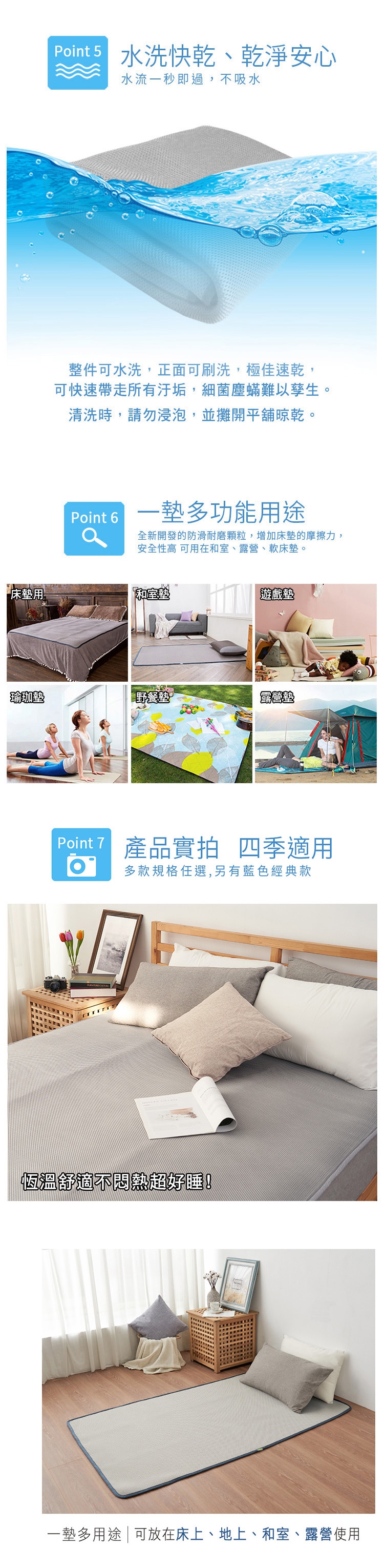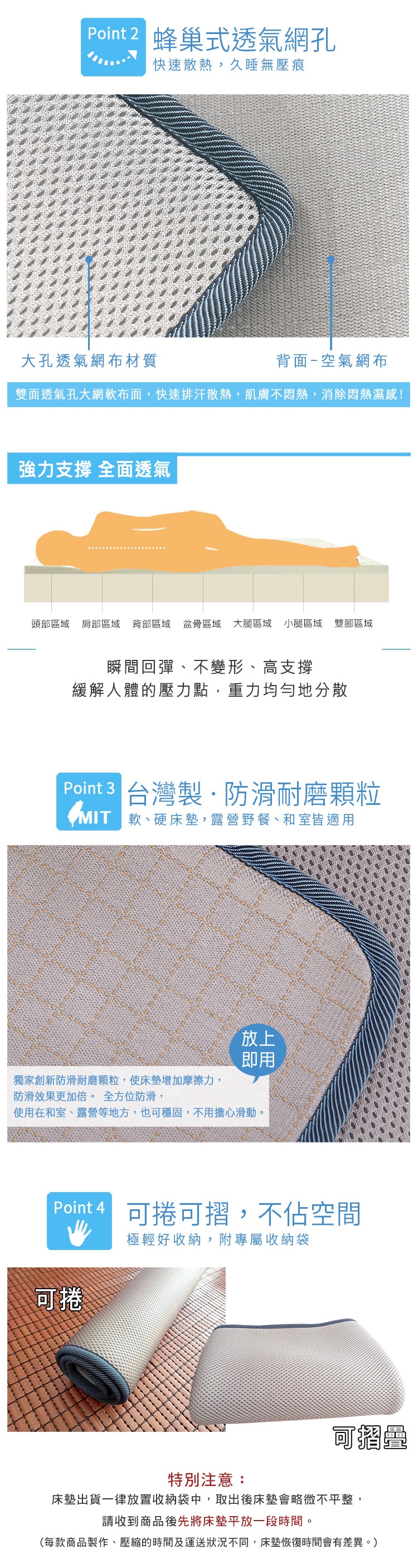 床墊表布大網孔快速透氣,躺臥時背部不悶熱;精緻包邊設計;背面防滑耐磨顆粒設計,讓床墊不易滑動。