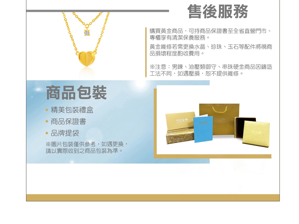 黃金具有延展、可塑性高的材質,如:做家事、游泳、泡溫泉等休閒活動,建議先取下,待活動結束時再配戴,以維持商品狀態。