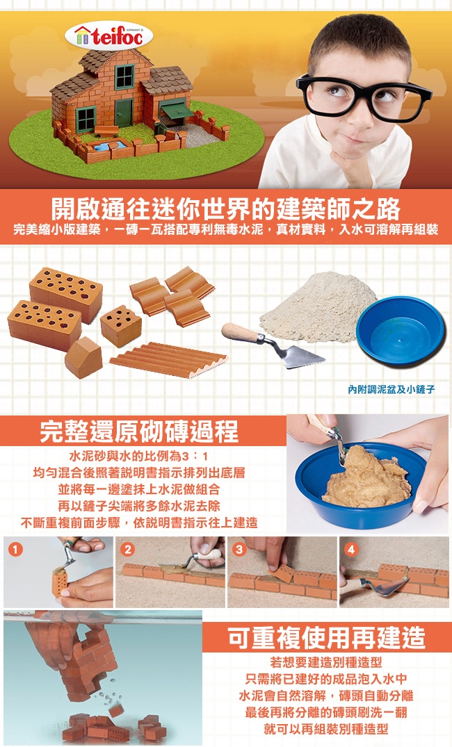 若想要建造成別種造型,只需將已建好的成品泡入水中,水泥會自然溶解,磚頭自動分離,最後再將分離的磚頭刷洗一翻,就可以再組裝別種造型。