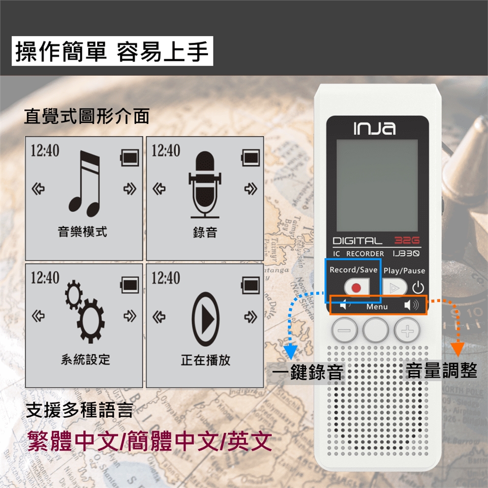 ●人性化按鍵設計,操作簡單,一鍵錄音