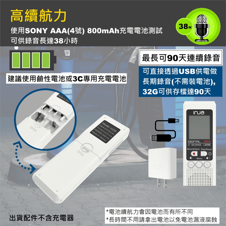 ●搭配附贈的充電器可90天連續錄音