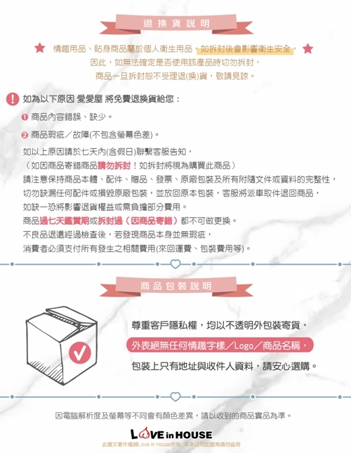 3.情趣用品屬個人衛生用品,在不影響檢查商品情形下,一但封膜貼紙或外膜破損視同已使用過,為衛生安全,恕不接受退貨!