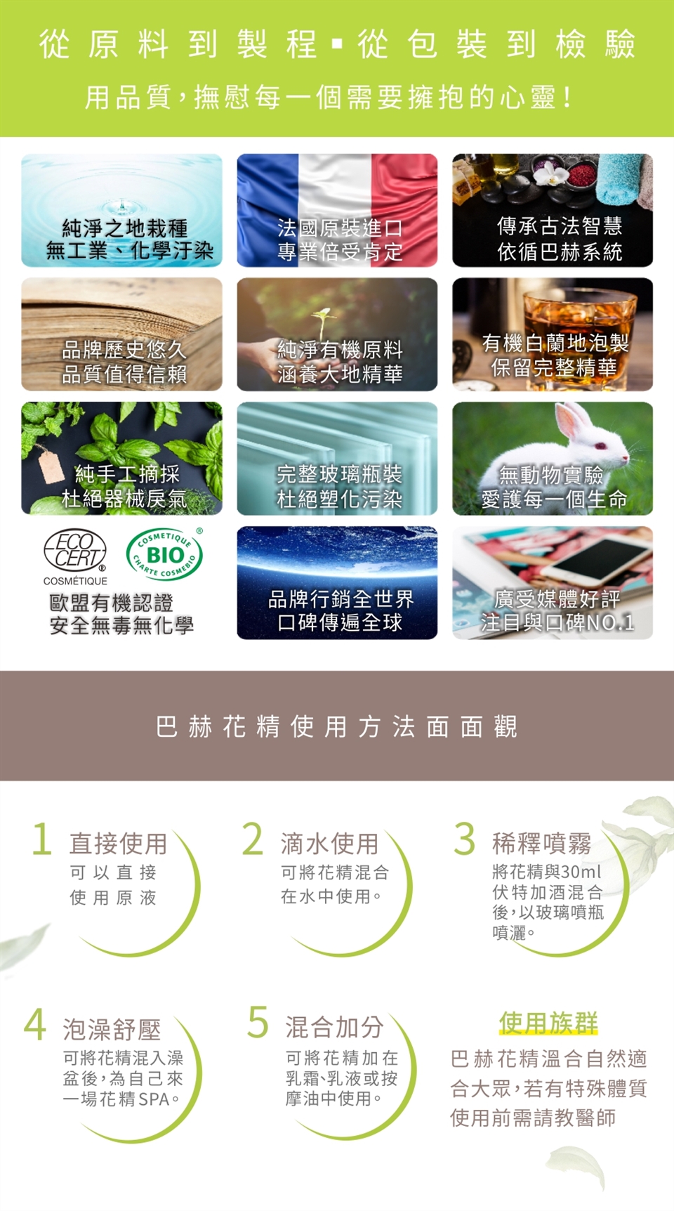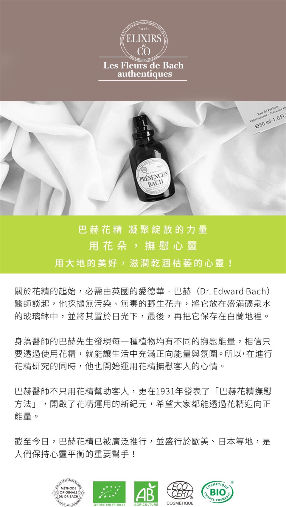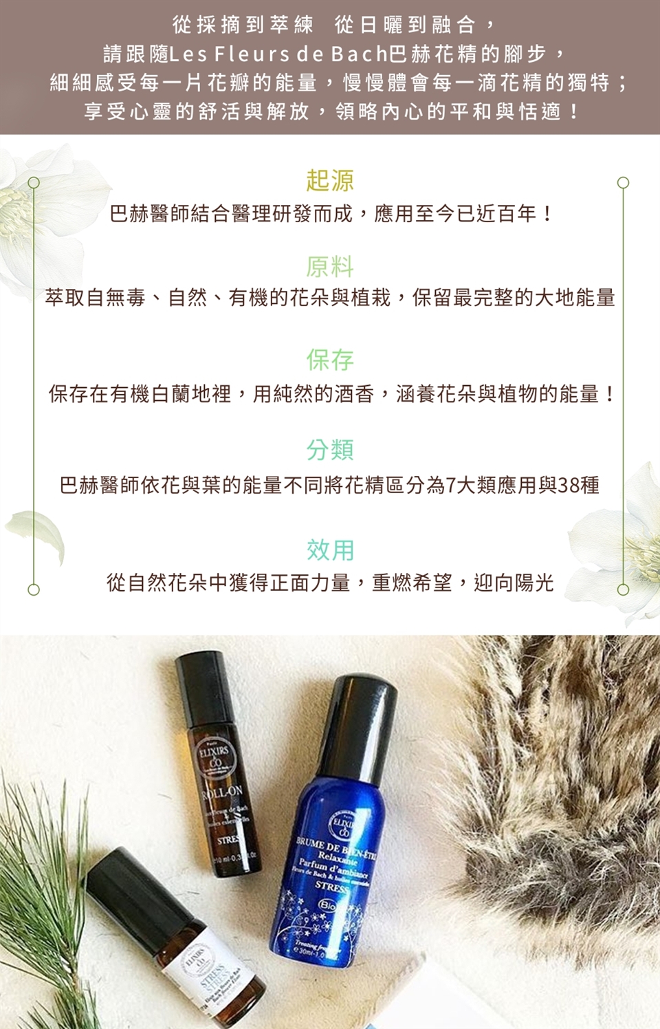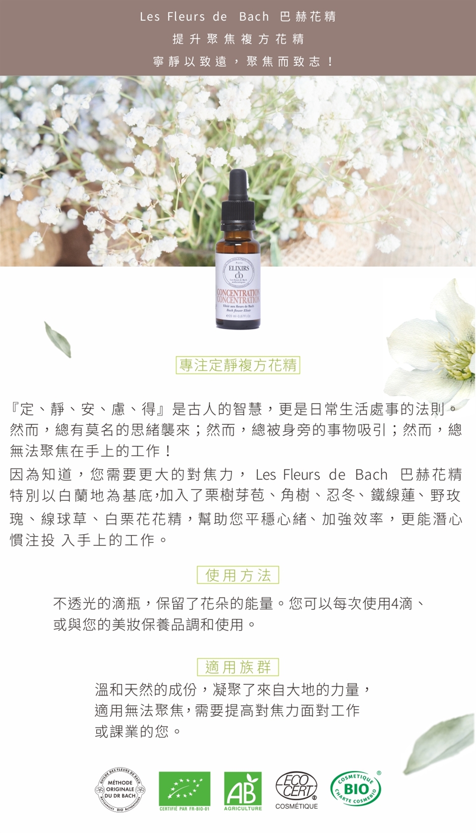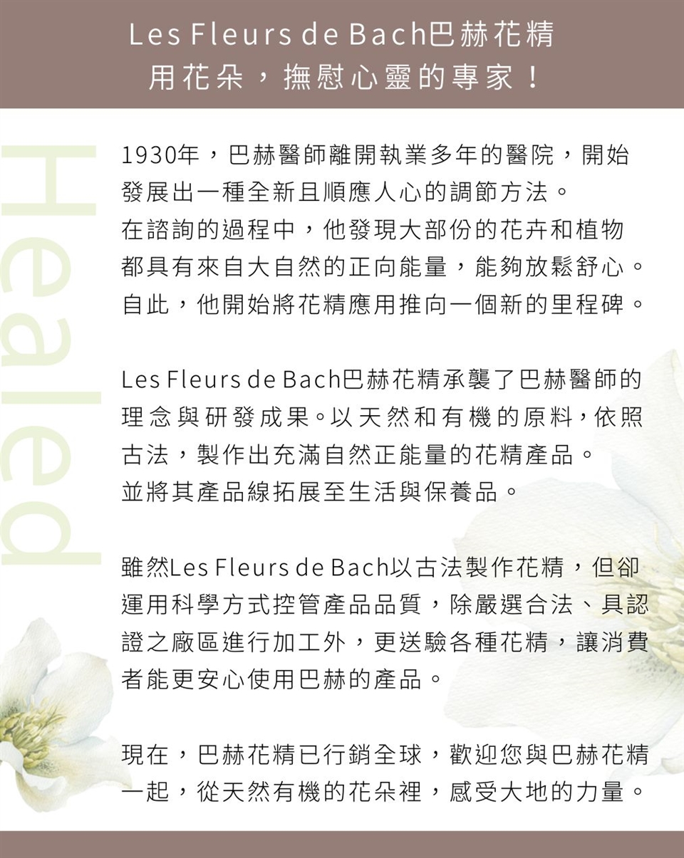 不透光的滴瓶,保留了花朵的能量。您可以每次使用四滴,也可與您的美妝保養品調合使用。