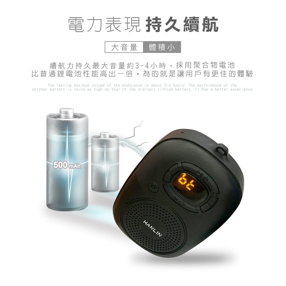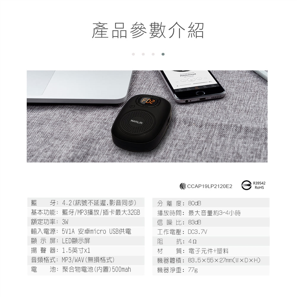 HANLIN-BTE200 隨身稀土重低音藍牙喇叭 (可插卡) 產品特點: 1.體積超小! 超迷你! 不破音 ! 而且聲音超大可達115分貝 !! 2.續航力長最大音量約3~4小時(依音量不同有所不同) 3.採用稀土材質的喇叭,低音渾厚有力扎實!! 非一般小喇叭可以比!! 4.可插TF記憶卡最大32GB 播放MP3/WAV音樂格式 5.可吊掛隨身攜帶~出遊旅遊等等超方便 6.藍牙播放音樂!~訊號不延遲!採用最新技術~保證影音同步!! 玩遊戲也能同步! 7.音量旋鈕設計~直覺性操作!! 8.外殼工藝採用TPU親膚質感設計 9.送人自用兩相宜!送長輩! 送小朋友! 操作簡單! 產品規格: 品牌:HANLIN 型號:BTE200 品名:隨身稀土重低音藍牙喇叭 (可插卡) 藍牙: 4.2(訊號不延遲,影音同步) 基本功能:藍牙/MP3音樂播放/ 插卡最大32GB 額定功率:3W 輸入電源: 5V 1A 安卓 micro USB供電 顯示屏:LED顯示屏 揚聲器:1.5英寸x1 音頻格式:MP3/WAV(無損格式) 電池:聚合物電池(內置)500mah 音樂播放時間: 最大音量約3~4小時(依音量不同有所不同) 分離度:80dB 失真度:1%(3.7V,1KHz,1W) 信噪比:83dB 工作電壓:DC3.7V 阻抗:4Ω 材質:電子元件+塑料 機器體積:83.5mm×55mm×27mm(W×D×H) 機器淨重: 77g 產品配件: 機器*1、說明書*1、手繩*1、電源/數據線*1 BSMI認證號 : R39542/ROHS NCC認證號: CCAP19LP2120E2 ![]() ![]() ![]() ![]() ![]() ![]() ![]() ![]() ![]() ![]() ![]() ![]() ![]() ![]() ![]() ![]() ![]() ![]() |