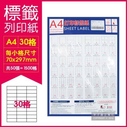 杰倫紙業-A4電腦標籤列印紙 30格 每包50張(影印、雷射、噴墨三用紙)