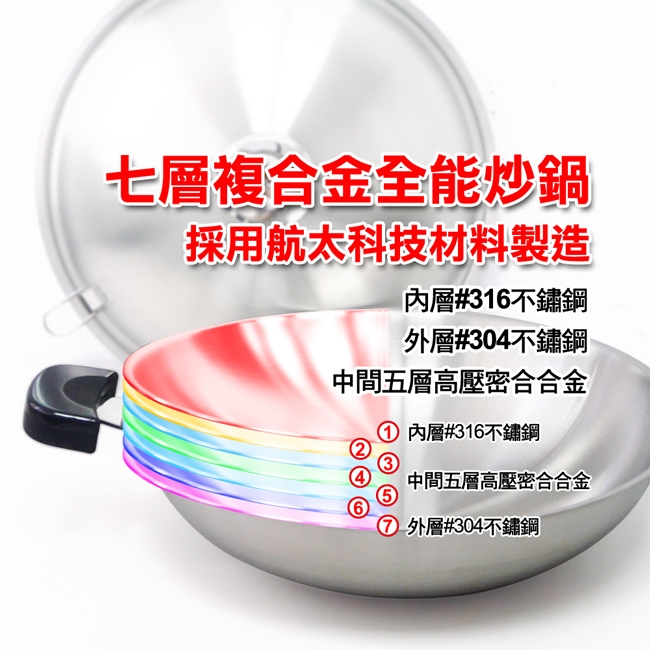 ◎七層複合金全能炒鍋採用航太科技材料製造而成