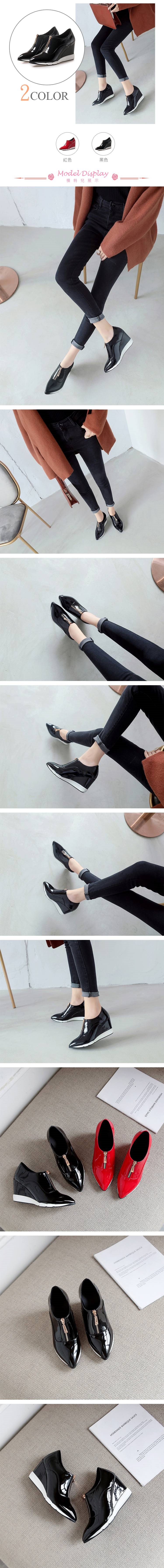 【Kissxxx】美腳效果尖頭亮漆皮深口坡跟單鞋黑