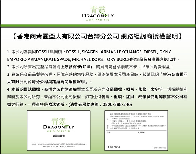 依照消費者保護法規定,線上購物消費者均享有商品到貨十天猶豫期之權益(並非試用期喔)。商品必須是全新狀態(不得有刮傷或拆封試戴),以及附上廠商原付所有附隨文件或資料之完整性(出貨時均有錄影詳列品項),才能享有這項服務喔。如有隨貨附贈品,經拆封使用恕無法辦理退貨。網頁圖片因拍攝關係會與實際商品略有色差,圖片僅供參考,顏色請以實際收到之商品為準。