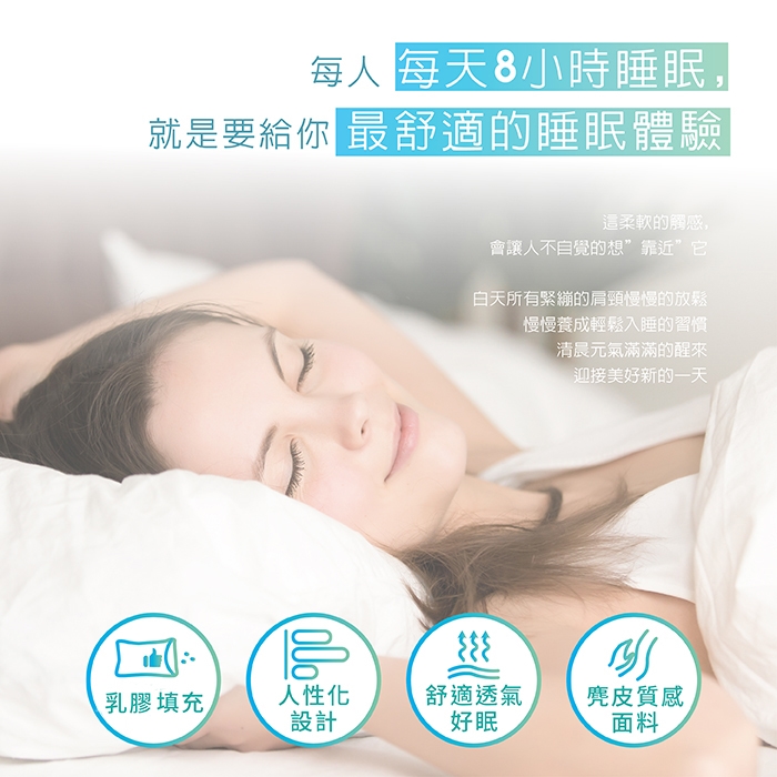 .柔軟彈性均勻服貼頸部頭部曲線,釋放肩頸壓力,良好的支撐效果,常保睡姿安穩舒適。
