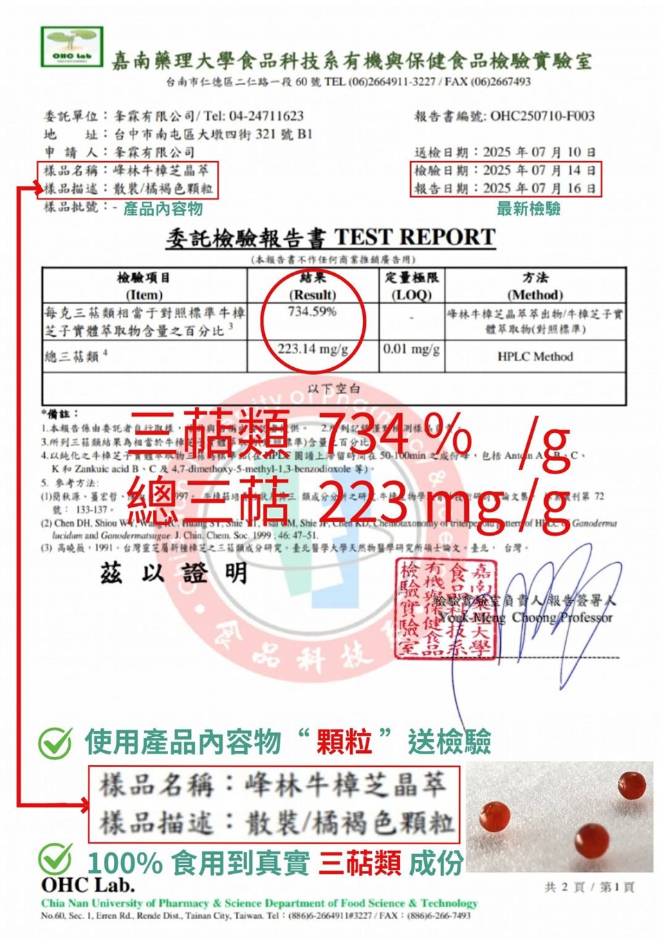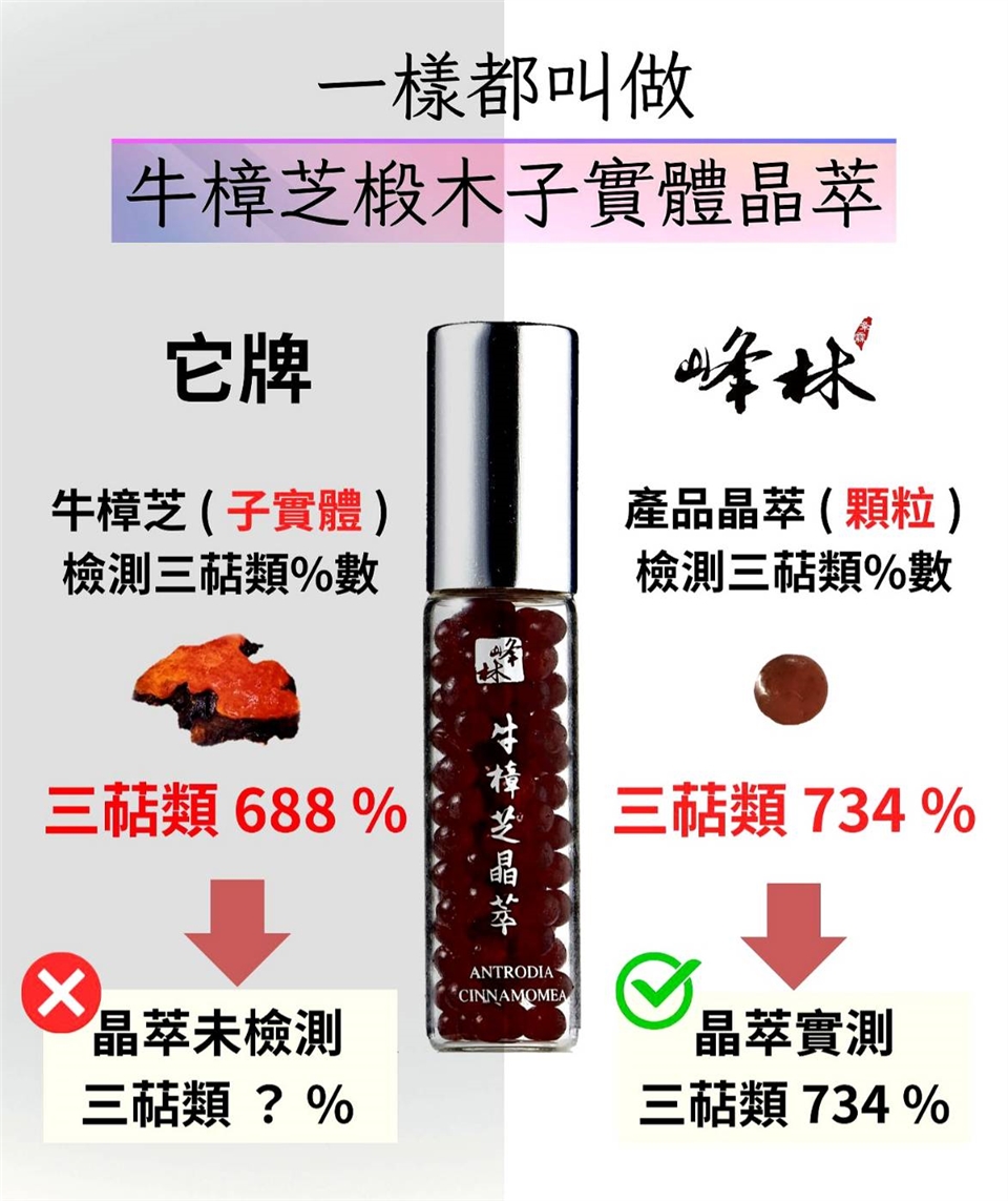 *峰林牛樟芝晶萃,使用 [ 產品內容物 ] 牛樟芝 ( 顆粒 ) 檢測三萜類%數,真實數據公開透明,真正食用到三萜類成份。