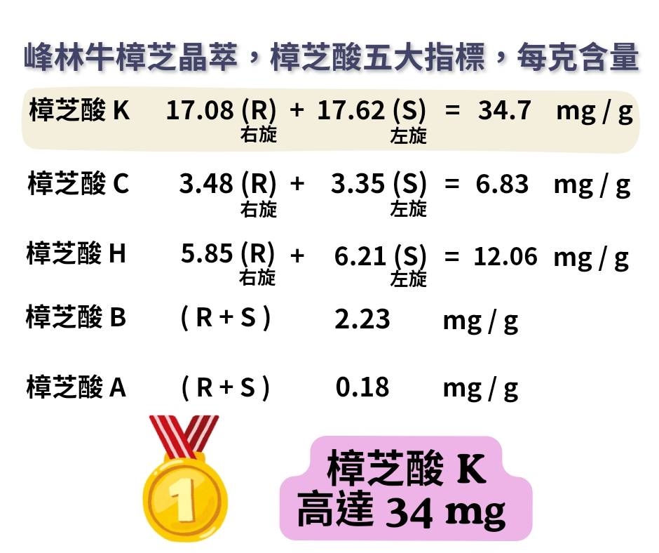 樟芝酸 K 17.08 (R) 右旋 + 17.62 (S) 左旋 = 34.7 mg/g