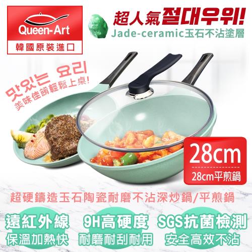 韓國Queen Art超硬鑄造玉石陶瓷耐磨不沾三件組(28CM鍋+蓋+28CM平煎鍋)