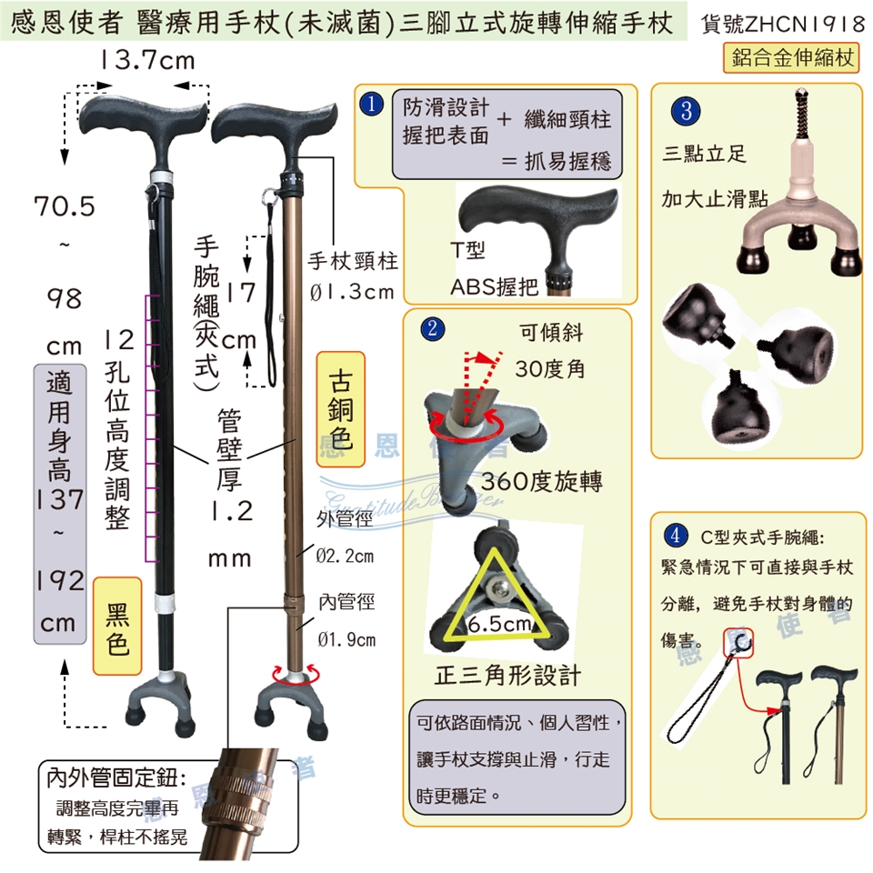 3.手杖的腳套為消耗品,當發現已磨損至底部為平面或已無止滑效果時,請立即更換新品使用,以避免危險。