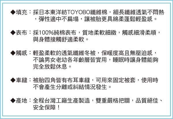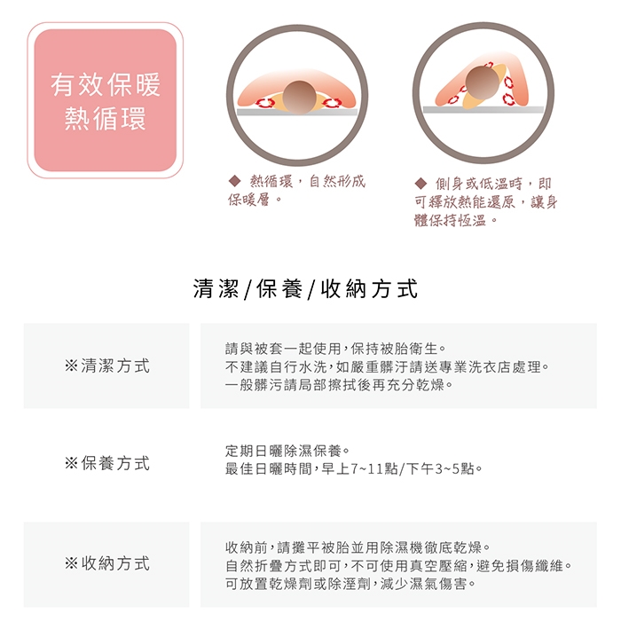 ★儲存人體多餘的熱能在纖維中循環吸收多餘體熱,調節體溫,讓身體能保 持在恆溫狀態,具長久性保暖功能,讓您擁有舒適暖和的被窩