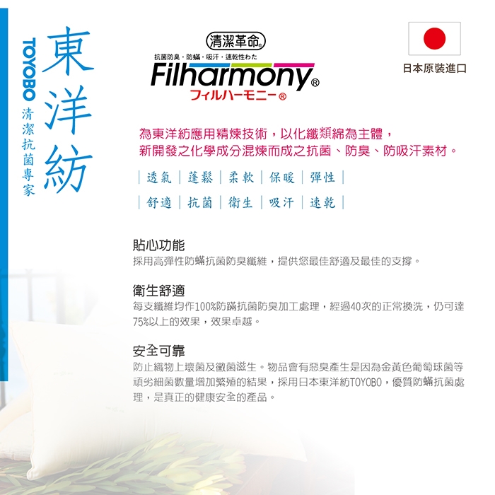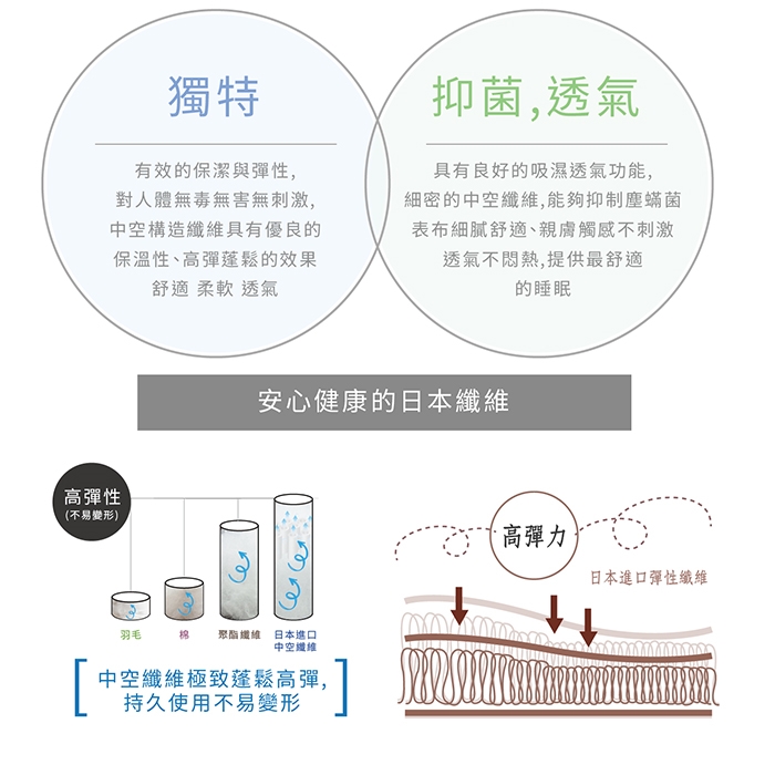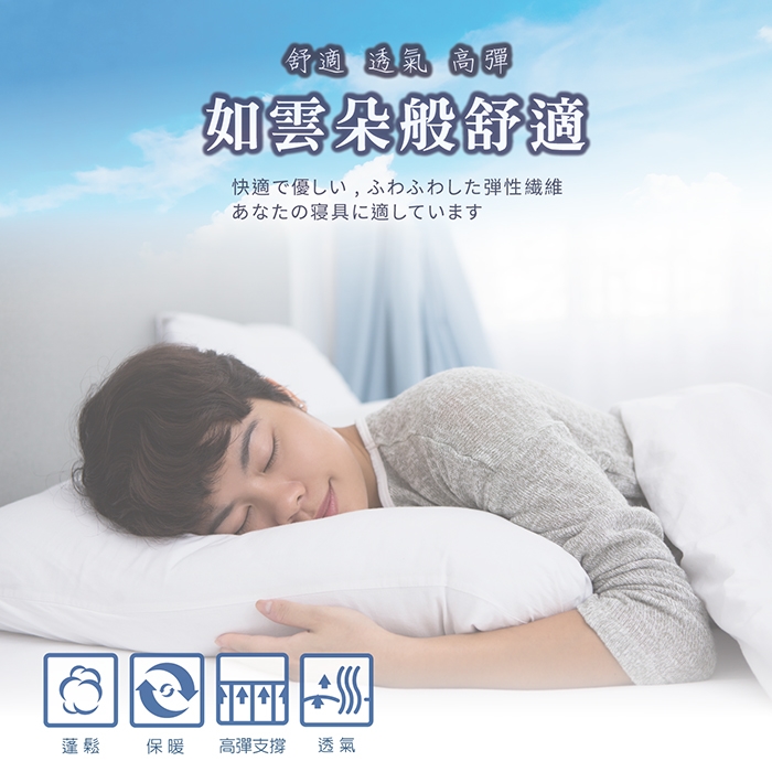 ★經過高彈性纖維處理,蓬鬆度及彈性特佳長久使用也不會扁塌,可在睡眠時釋放疲倦壓力,溫柔觸感,極輕量、極親膚