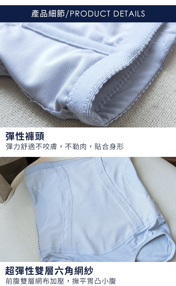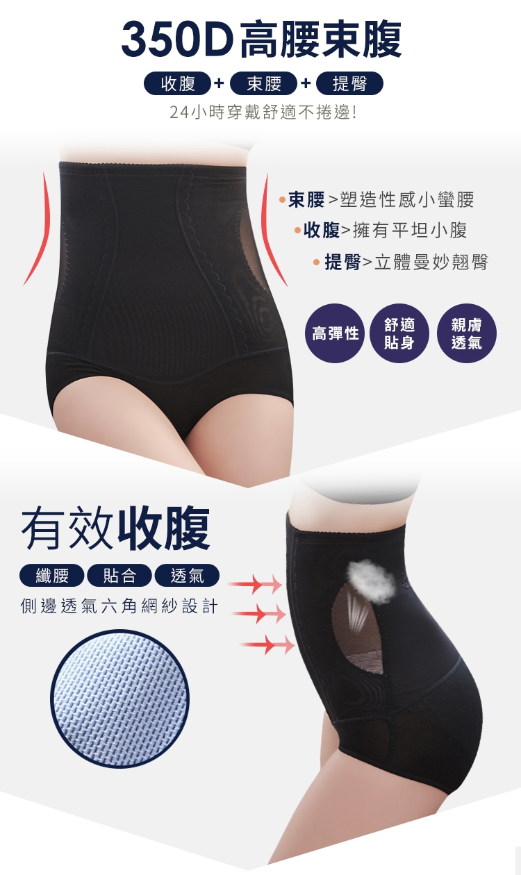 ◎超高腰加強版型+超彈性雙層六角網紗束腹塑腰、不悶熱。