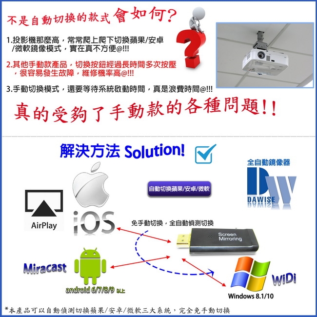 支援影音同步傳輸模式: AirPlay/Miracast/DLNA/WIDI