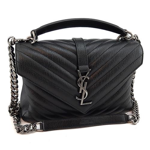YSL 黑色山形紋牛皮復古霧銀鍊肩背斜背兩用學院包