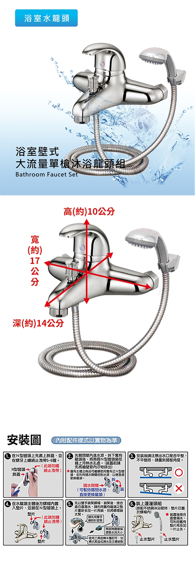 5. 本商品內容:龍頭主體、鍍鉻掛座X1個、不銹鋼軟管X1條、鍍鉻蓮蓬頭X1支