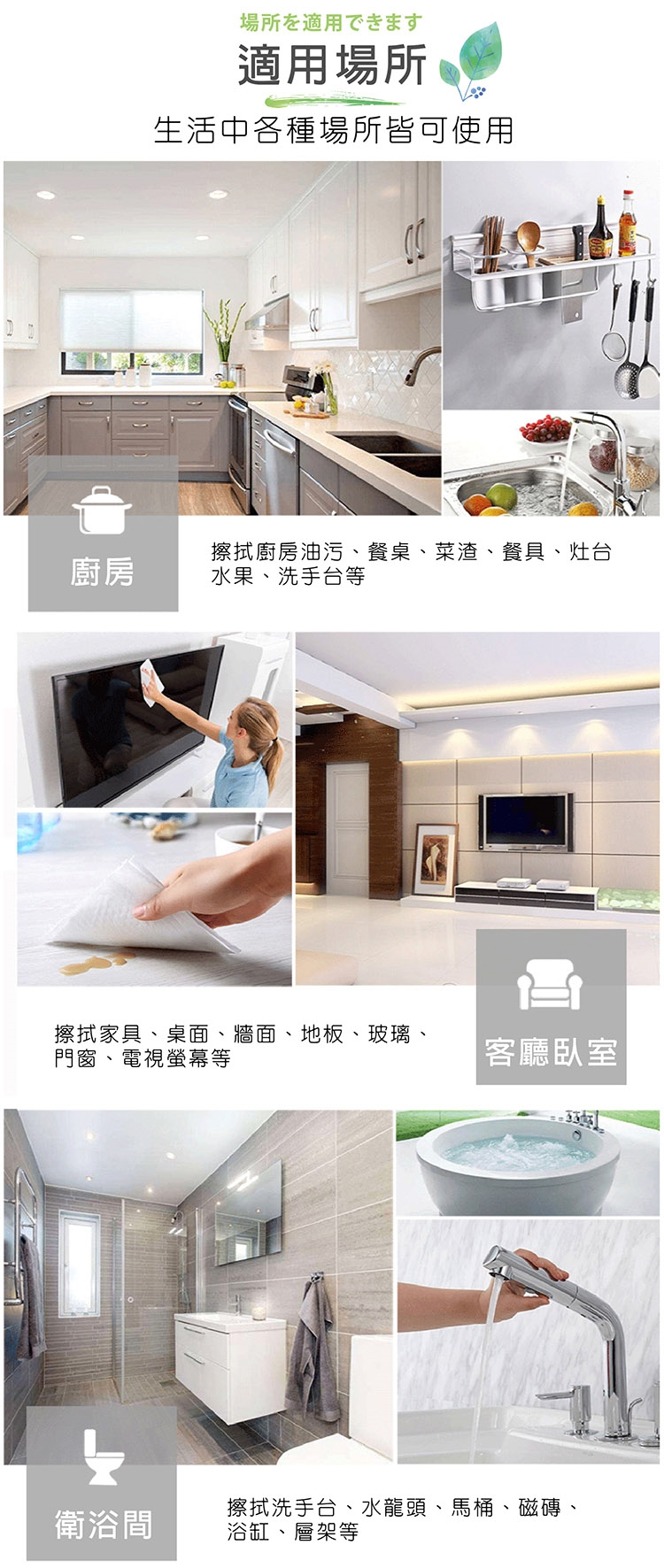 使用於廚房於擦拭油污,擦拭玻璃或鏡子,吸水去塵