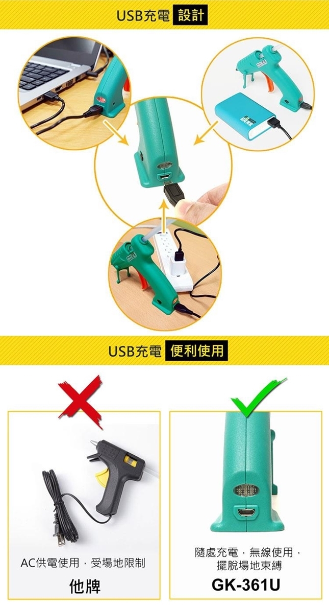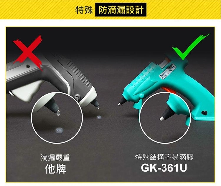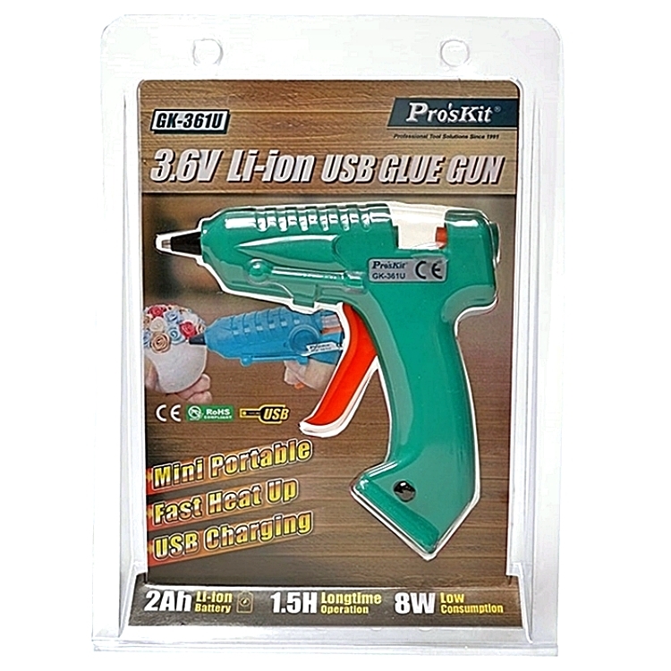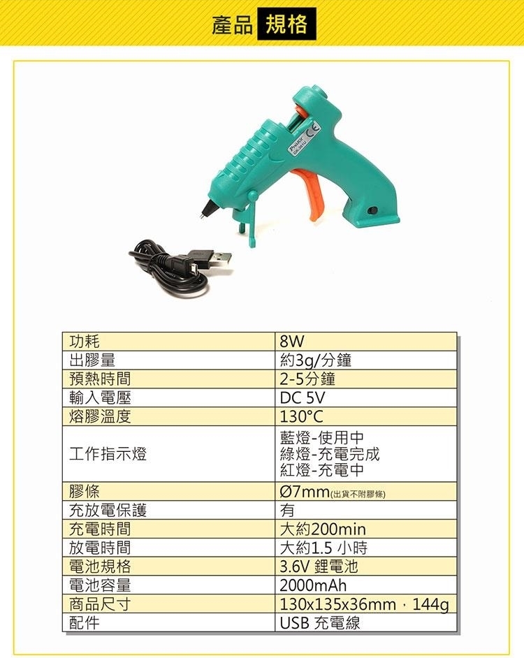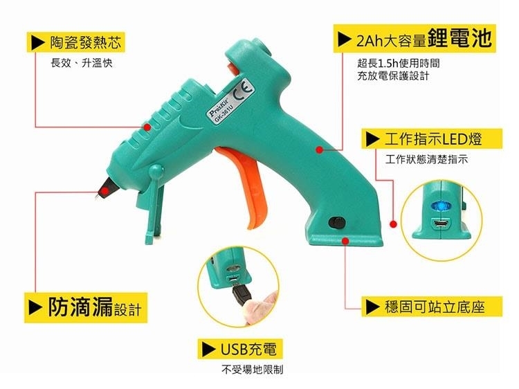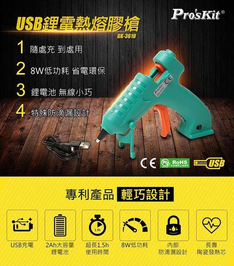 ●【品名】台灣Pro'sKit寶工無線快速陶瓷加熱 芯USB充電熱熔膠槍GK-361U不滴膠熱溶膠槍(不滴膠;2000mAh鋰電池;8W低功耗)快速預熱融膠槍