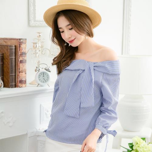 全尺碼-一字領露肩鬆緊翻領綁結上衣(共三色)lingling