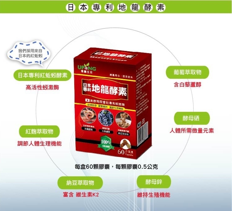 本產品所使用原料為第6代蚓激酶,具有高單位、高活性等特色,搭配白藜蘆醇、酵母鋅、酵母硒、紅麴萃取物、納豆萃取物等專業精選配方,是滋補強身、健康維持、循環順暢好幫手,蚓出您的健康活力!