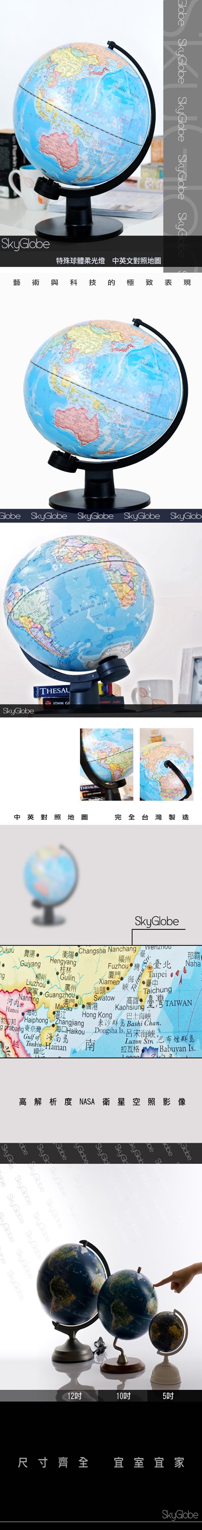 SkyGlobe堅持台灣原創,每年皆採用最新的世界地圖來生產製造,開發不同尺寸與功能,細膩刻劃每個細節,創造美感與實用兼具的地球儀。