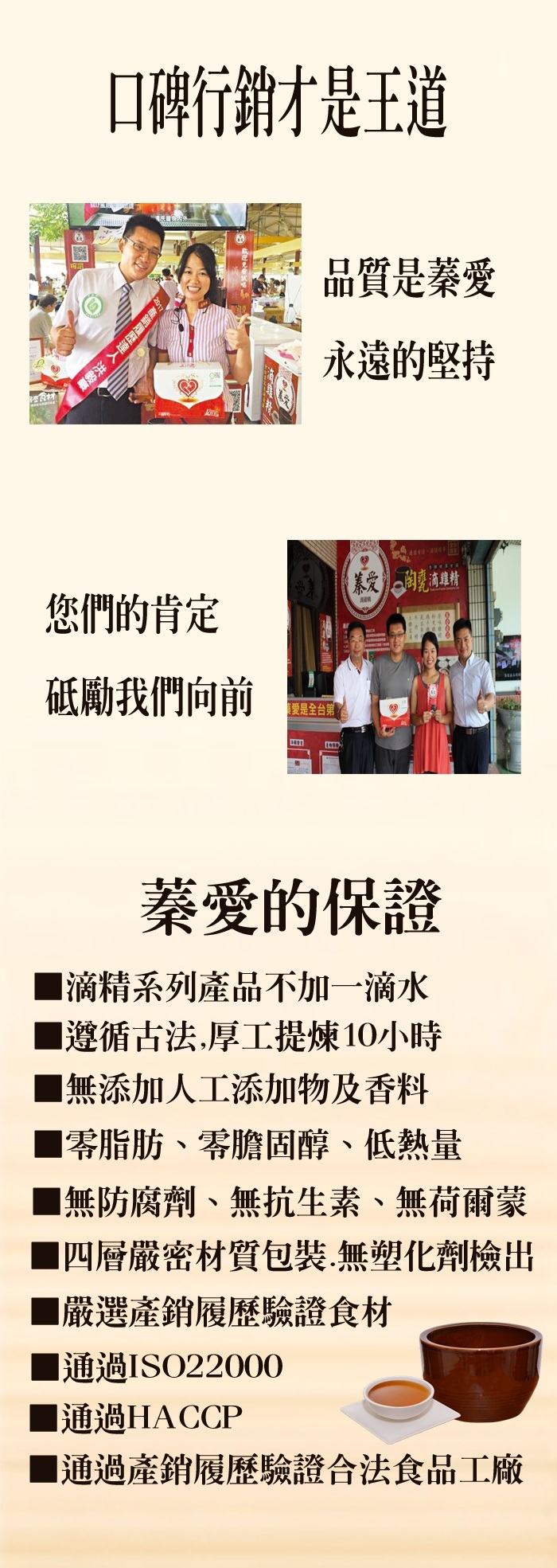 蓁愛的緣起來自阿嬤對子孫的呵護,用古早陶甕經10小時細火慢燉提煉雞精給家人喝,讓大家對陶甕雞精有了深厚的感情,進而決定將雞精當作家傳的事業!了解國人對於家人之照顧與補身養生觀念的重視,蓁愛堅持優質是最好的品牌,顧客是最佳的代言人.未來將繼續傳承祖母的智慧精神,遵循傳統作法,積極投入研發更多養生產品,讓蓁愛一直傳承~