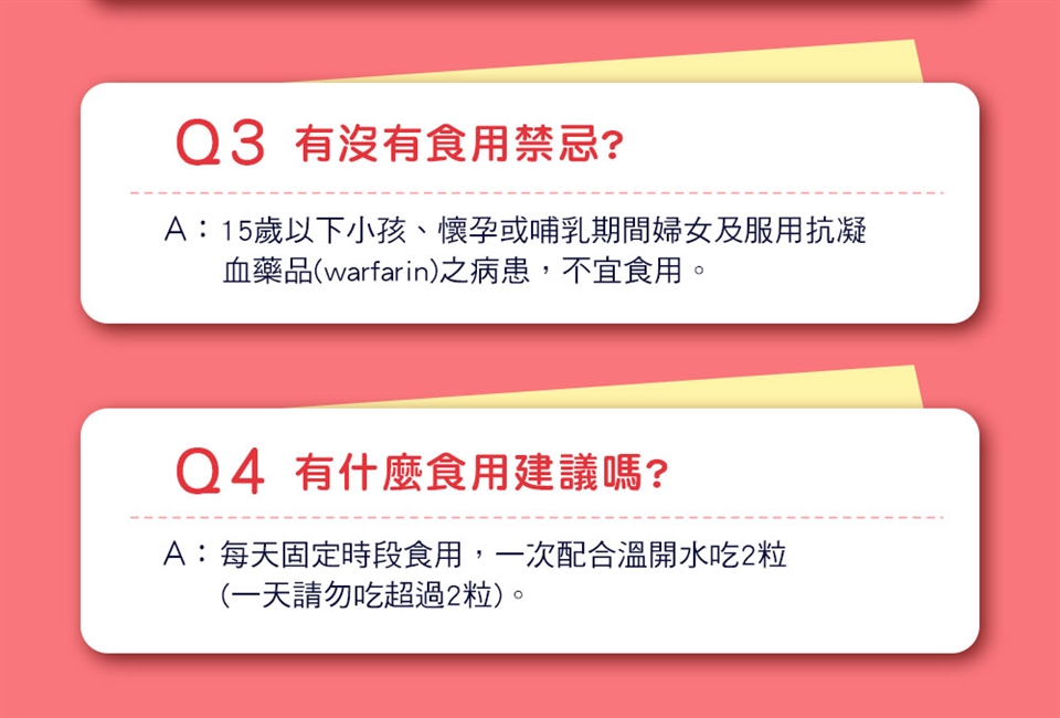 1.15歲以下小孩、懷孕或哺乳期間婦女及服用抗凝血藥品(warfarin)之病患,不宜食用。br/2.重大疾病及體質過敏者應先請教專業醫藥人員後選擇食用。br/3.本產品非藥品,供保健用,罹病者仍需就醫。