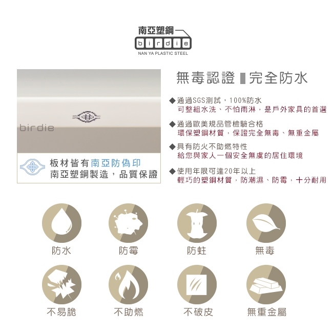 堅持使用經過嚴格品管的台灣南亞塑膠工業所生產的塑鋼板材,每片板材皆有南亞塑鋼防偽印!