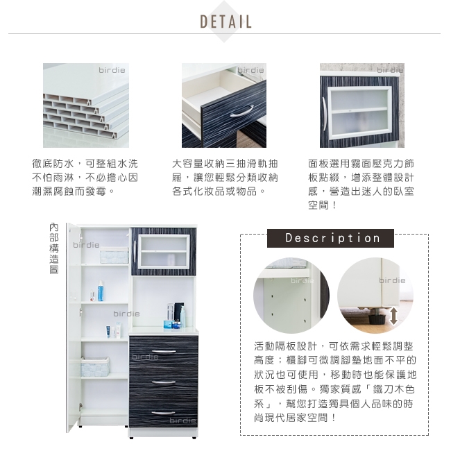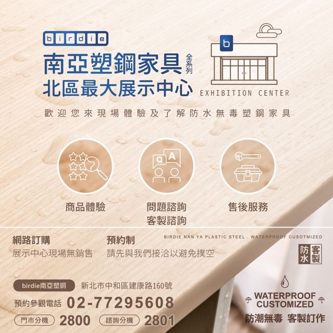 100%徹底防水板材,不怕浸水、適用長期潮濕的環境,可整組水洗清潔更容易,不因潮濕而變形、腐蝕、掀皮;具防蟲蛀抗黴菌特性,防白蟻、蟑螂侵蝕,長久使用也不用擔心塌陷變形!