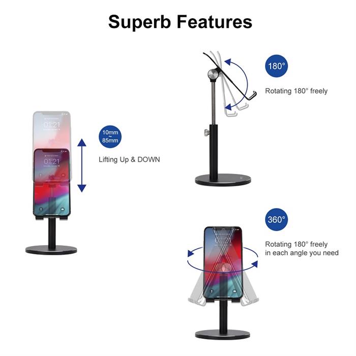 【產品優勢】我們除了提供了180度的可調視覺角度,支架可升降高度更符合眼睛的平行視覺高度, 拒當低頭族. 可旋轉角度提供你與您的朋友更好的互動角度. 多種調節功能以符合日常生活中各種不同需求的應用。高度加高更適合自拍跟直播使用