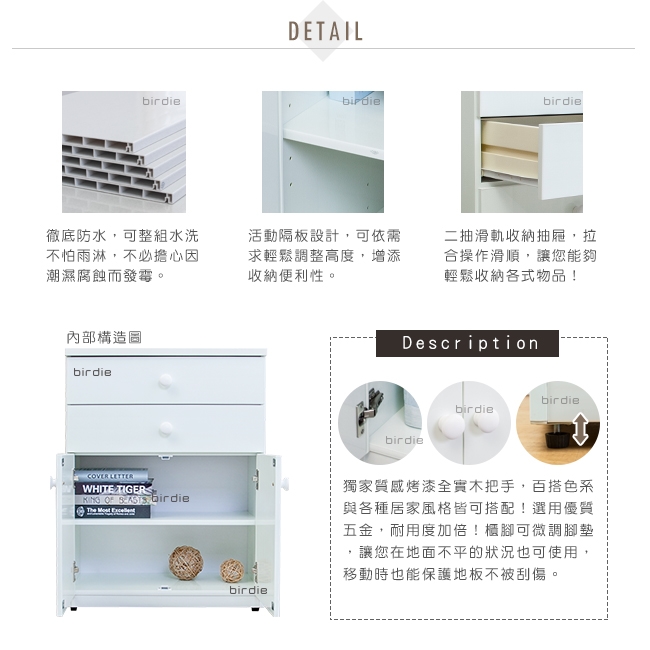 100%徹底防水板材,不怕浸水、適用長期潮濕的環境,可整組水洗清潔更容易,不因潮濕而變形、腐蝕、掀皮;具防蟲蛀抗黴菌特性,防白蟻、蟑螂侵蝕,長久使用也不用擔心塌陷變形!